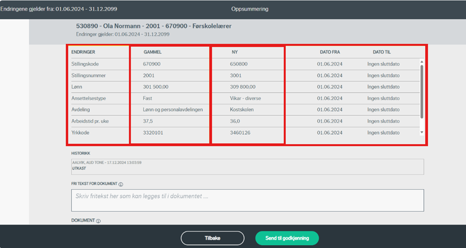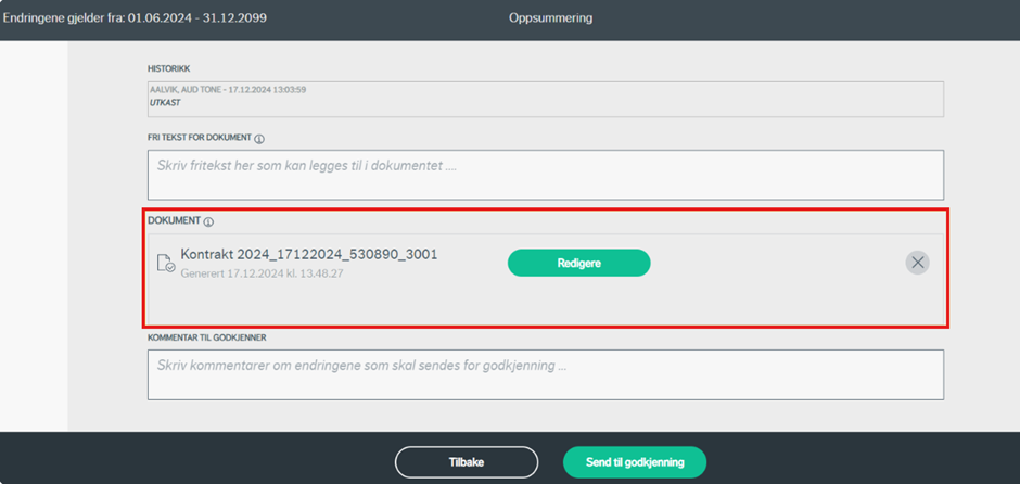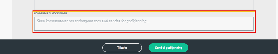 Etter at alle felter i oppsummeringen er utfylt, kan du sende endringene til godkjenning ved å trykke "send til godkjenning".
