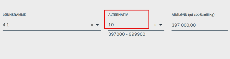 Under «lønnsramme» legger man inn den lønnsrammen stillingen tilhører. Under alternativ vil man ha to valg: