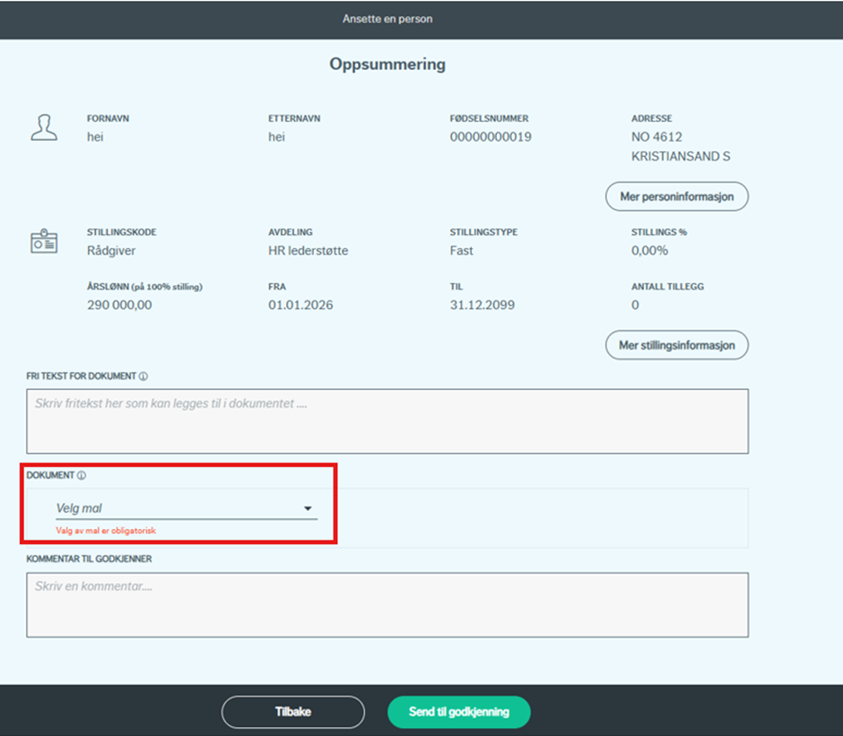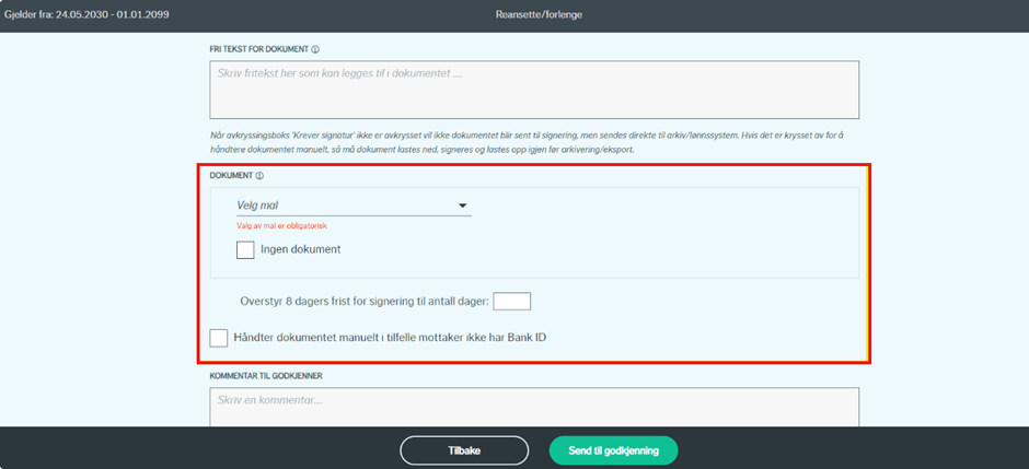 Valg av dokument er obligatorisk da det må genereres ny kontrakt for endringene i ansettelsen.