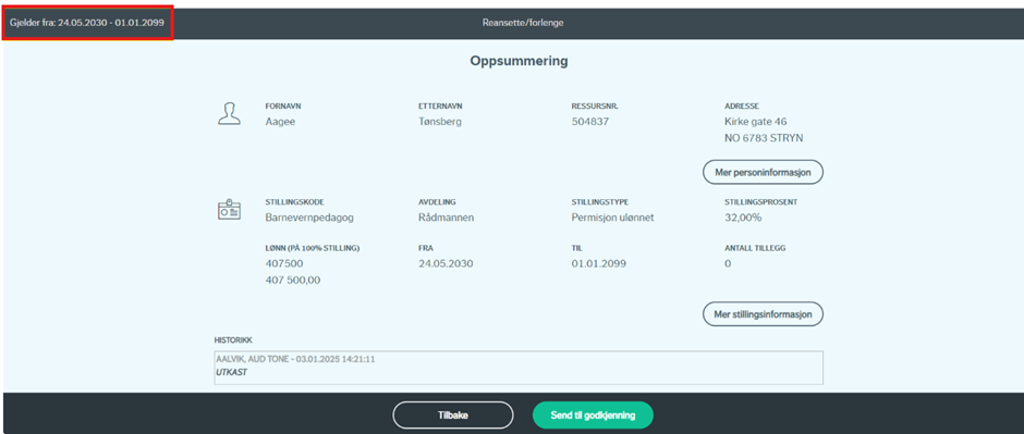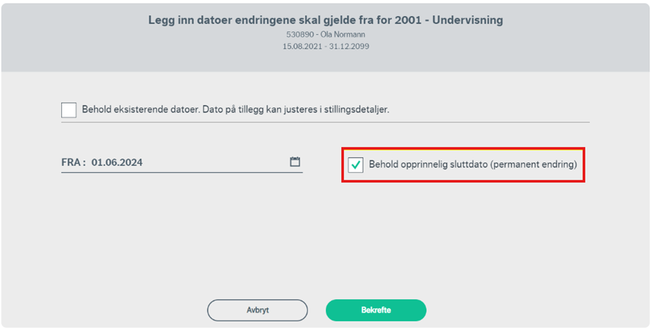 Ved valg av "behold opprinnelig sluttdato (permanent endring)" vil endringen gjelde frem til stillingens sluttdato.