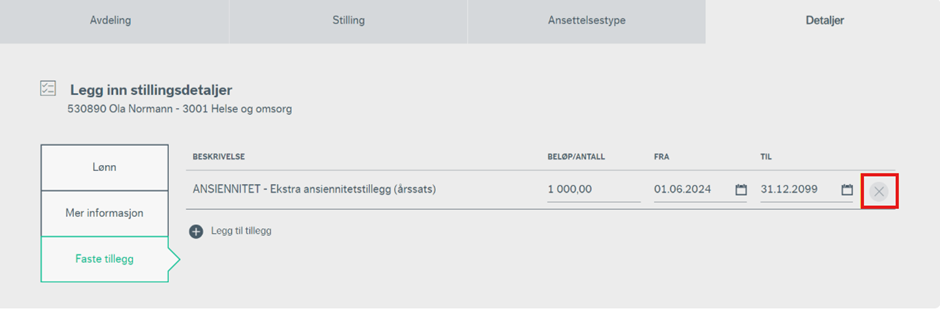 For å slette et tillegg kan du trykke på krysset til høyre i den aktuelle raden og tillegget vil fjernes. Merk at sletting av tillegg vil kunne påvirke allerede utbetalte beløp.