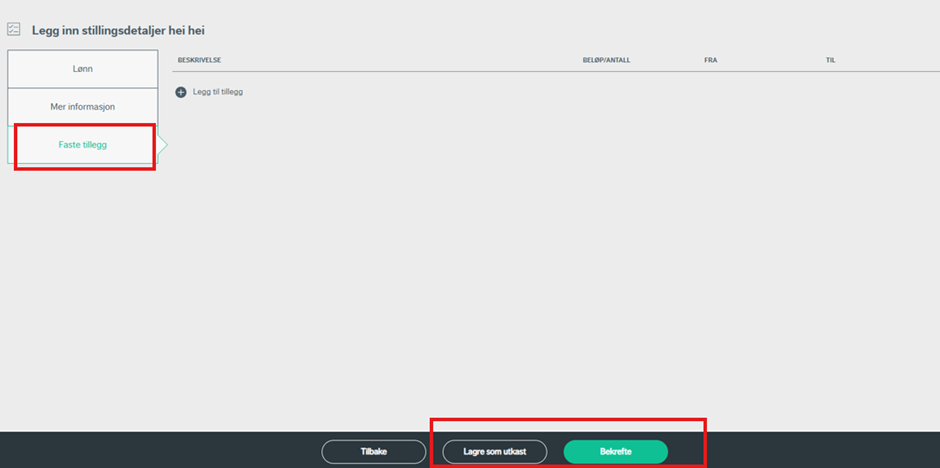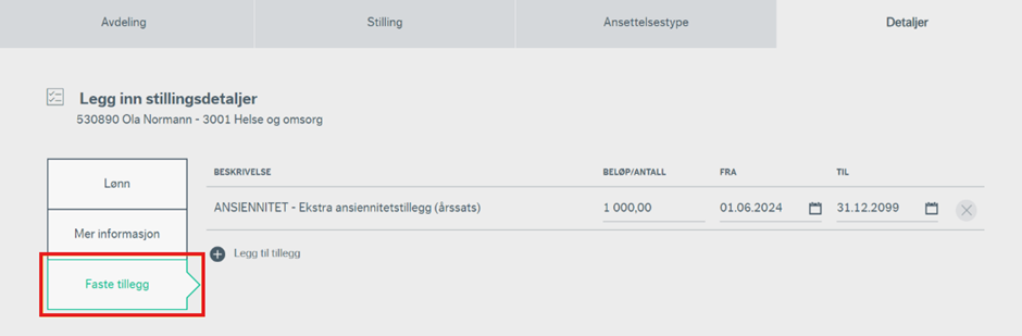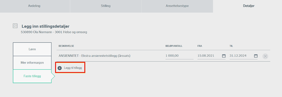 Under «Faste tillegg» legger du inn de tilleggene kandidaten skal ha knyttet til denne stillingen. Dette gjelder eksempelvis funksjonstillegg, kompetansetillegg osv.