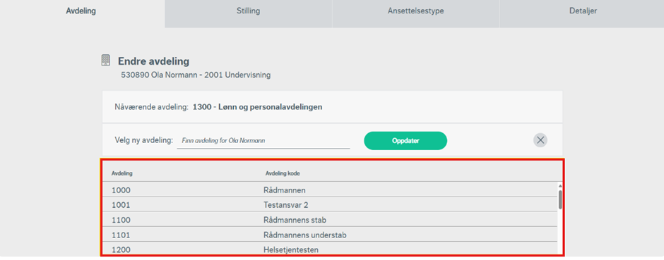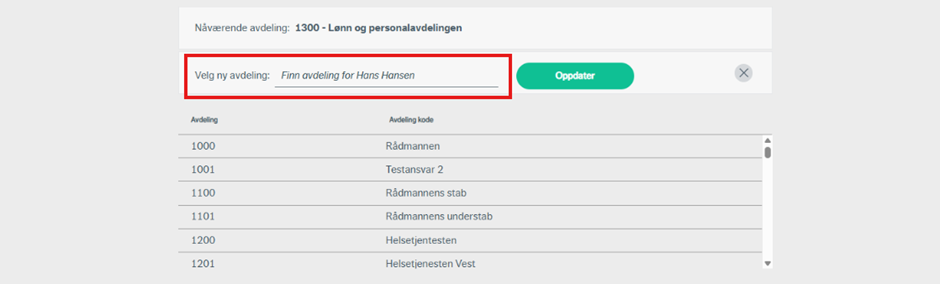 I det samme bildet vil du også bli bedt om å velge ny avdeling for avdelingsbyttet. Søkefunksjonen her vil fungere på lik linje med steg for avdeling i prosessen for å legge til ny ansatt. Når du har funnet riktig avdeling, trykker du på «oppdater».