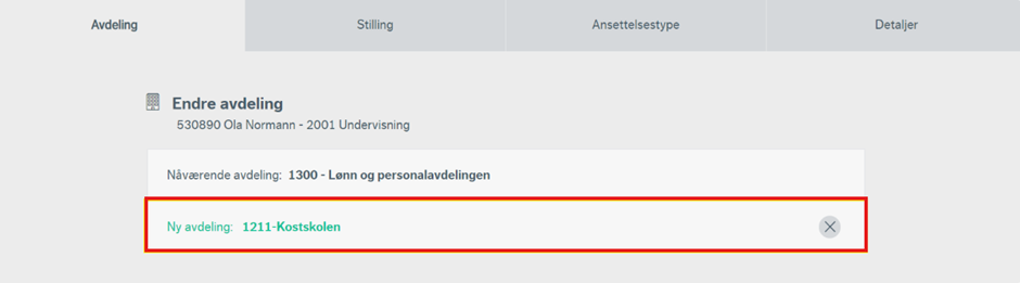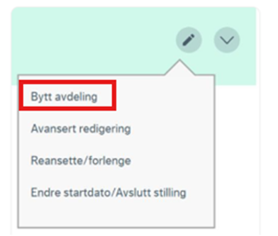 Både ved endring av avdeling, stilling eller endring av ansettelsestype, kan du gjøre endringer ved å trykke på knappen for endring. Du vil ved endring av avdeling få opp en liste over de avdelinger du har tilgang til. Dersom du kun har tilgang til én avdeling, vil det ikke være mulig å endre avdeling.