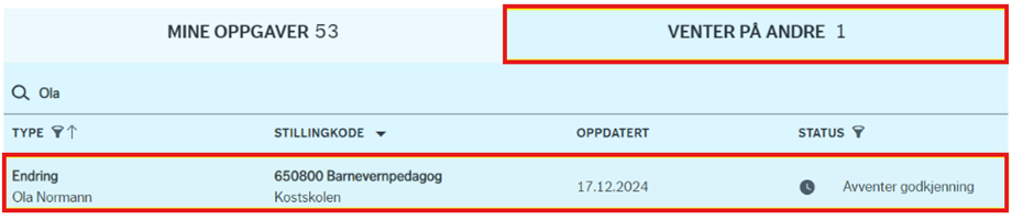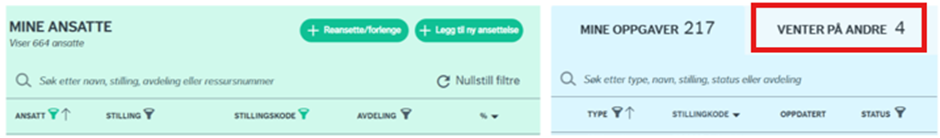 Under venter på andre vil du kunne følge dine oppgaver som ligger til behandling hos andre. For eksempel anvisning (godkjenning) av personalmeldingen. Dersom man har sendt en arbeidsavtale til en kandidat for signering, vil du kunne finne oppgaven her med status «venter signering». (For mer detaljer – se Portal).