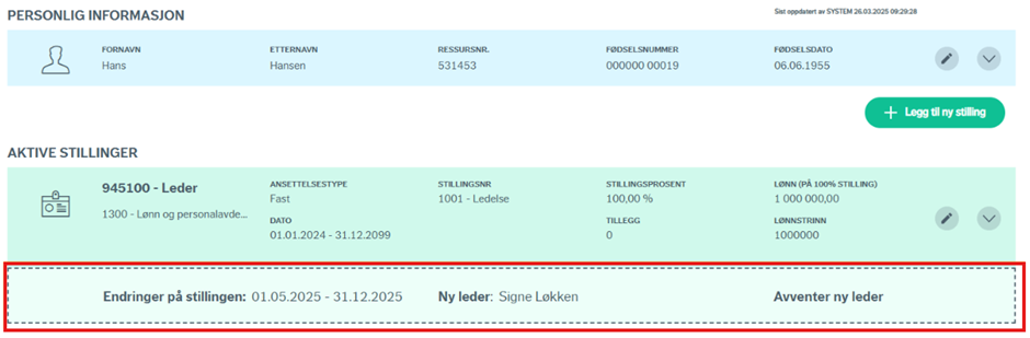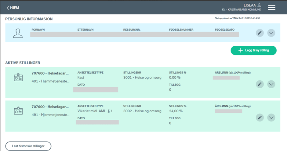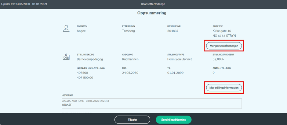 Boksene med "mer personinformasjon" og "mer stillingsinformasjon" viser utdypende informasjon om personen og stillingen.