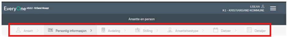 Du skal her gjennom følgene steg: Ansatt, Personlig informasjon, Avdeling, Stilling, Ansettelsestype, Datoer og Detaljer. Underveis i denne prosessen vil du komme innom ansiennitetsberegning og generering av arbeidsavtalen. Både ansiennitetsberegningen og arbeidsavtalen lagres automatisk i P360.
