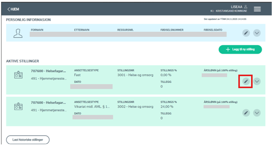 For endringer på stillinger finner man redigeringssymbolet ved å gå inn på den aktuelle stillingen.