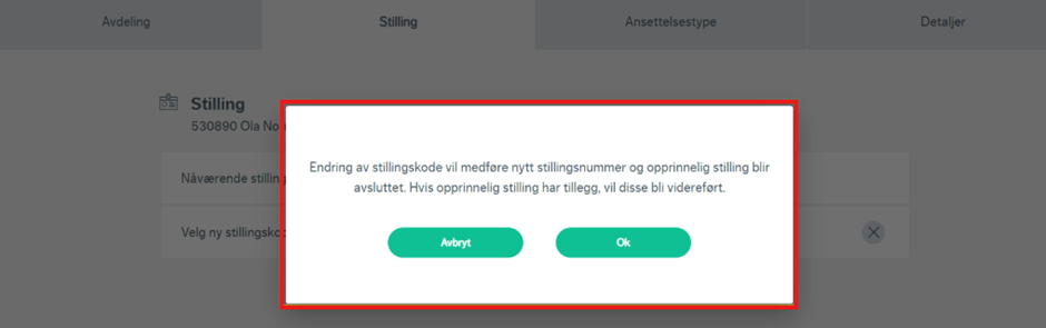 NB! Ved endring av stillingskode, kan dette medføre nytt stillingsnummer og avslutning av opprinnelig stilling dersom den nye stillingskoden tilhører en annen gruppe. I så fall vil du få opp et varsel for å bekrefte at endringene er korrekt. Tillegg på opprinnelig stilling vil bli videreført dersom dette eksisterer. I tilfeller der ny stillingskode tilhører samme gruppe som opprinnelig stillingskode, vil eksisterende stillingsnummer videreføres.