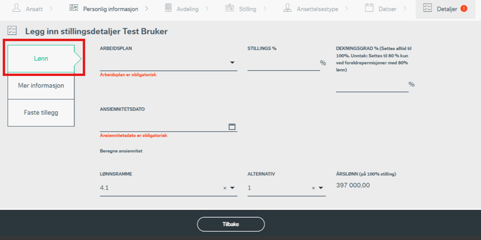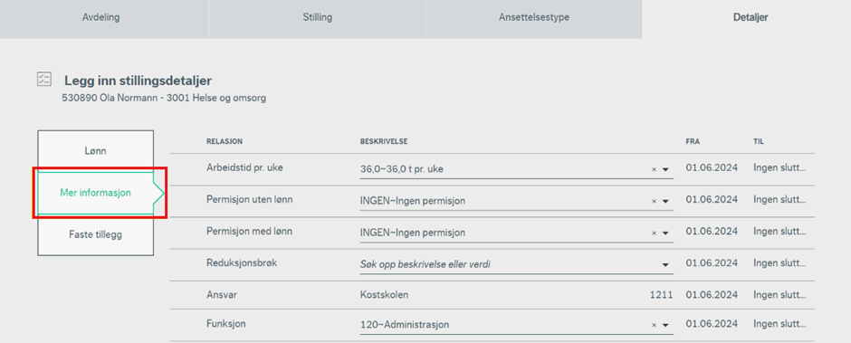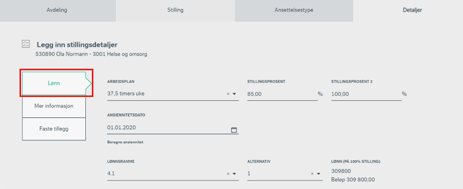 Under detaljer skal du legge inn stillingsdetaljene på ressursen. I sidemenyen finner man tre steg man må gjennom; Lønn, Mer informasjon og Faste tillegg.