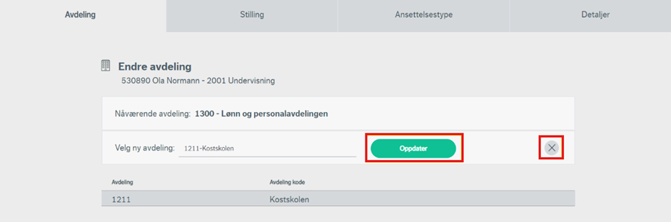 Velg ny avdeling (det samme gjelder for stilling eller ansettelsestype) og trykk oppdater for å beholde endringen. Dersom valget er feil eller ikke skal endres likevel, kan du forkaste valget ved å trykke på krysset til høyre for valgt verdi. Du kan nå søke på nytt.