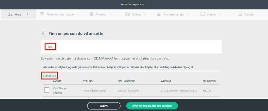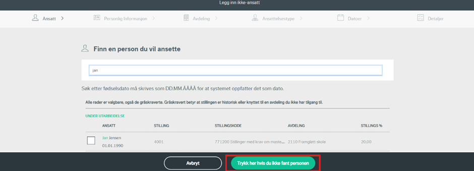 Ved registrering av ny ansettelse må du først søke opp om personen allerede finnes i vårt system/ressursregister. Dersom du ikke finner den, trykker du på «klikk her hvis du ikke fant personen». Merk at dersom ansettelsen kommer via forsystem (Webcruiter), så vil flere av feltene være forhåndsutfylte.