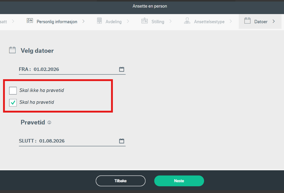 Under datoer registrerer man startdato for stillingen. Avhengig av hvilken ansettelsestype du har valgt, fyller du også inn sluttdato. Det er viktig å ta stilling til om ressursen skal ha prøvetid eller ikke, og hvor lang denne skal være.