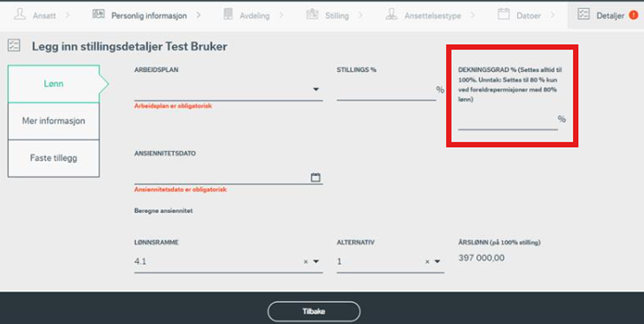 «Dekningsgrad» skal alltid settes til 100%, med unntak av foreldrepermisjoner med 80% lønn.