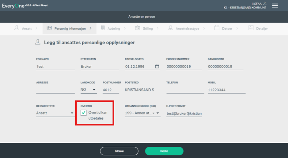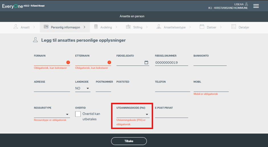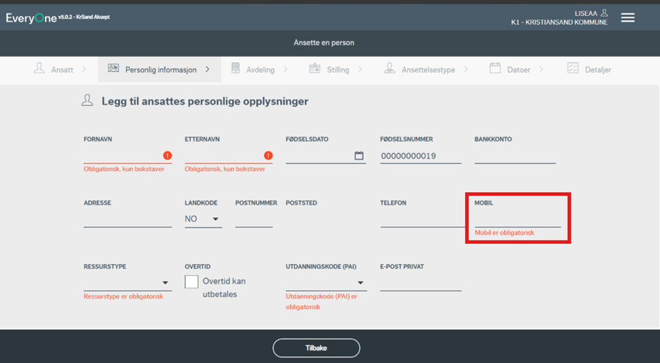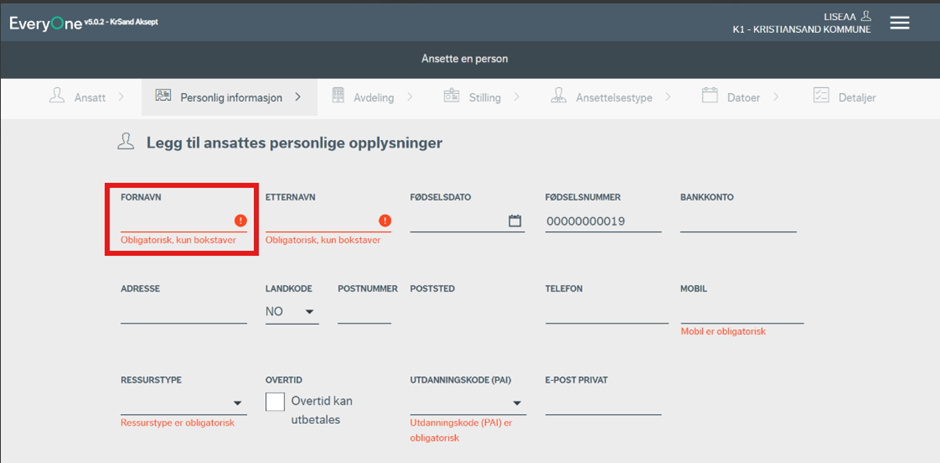 Du vil nå bli ført videre til siden hvor personlig informasjon må registreres. Flere av feltene er obligatoriske, og systemet varsler ved eventuelle feil eller mangler. Merk at dersom ansettelsen kommer via forsystem (Webcruiter), så vil flere av feltene være forhåndsutfylte.