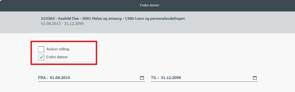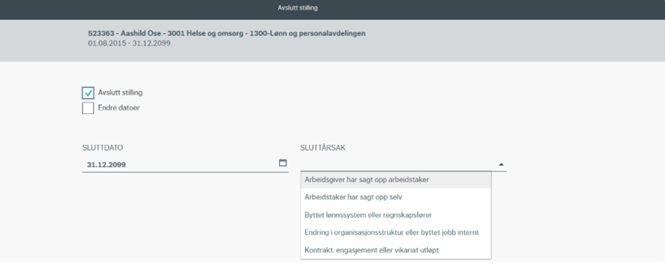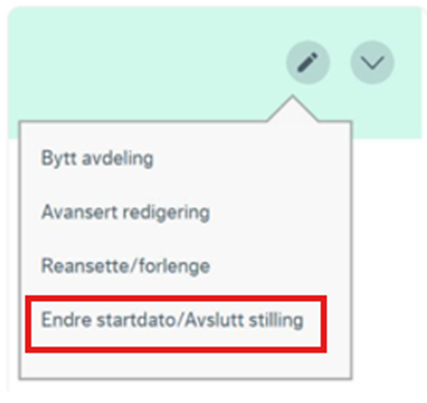Ved å klikke på "endre startdato/ avslutt stilling" vil du bli ført til valgene "avslutt stilling" eller "endre dato".