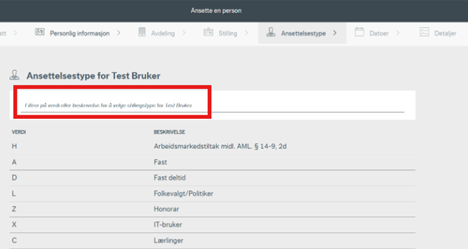 Neste steg i prosessen er å velge ansettelsestype. For fullstendig oversikt over alle ansettelsestyper se Dokument «Ansettelsestyper i Personalmodulen», ID 20670 - EQS .