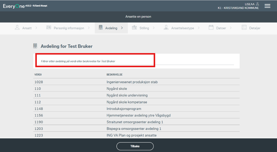 Videre velges avdelingen stillingen skal knyttes opp mot. Her vil en liste over tilgjengelige avdelinger komme opp. Du kan også søke etter avdeling ved å bruke søkefeltet.