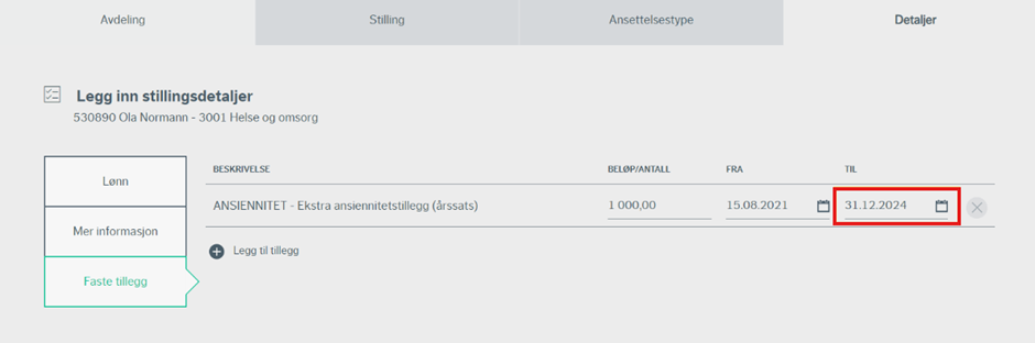 For å stoppe et tillegg kan bruker endre dato til på det aktuelle tillegget.