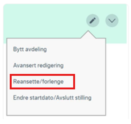 Merk at funksjonen "reansette/forlenge" vil opprette en ny stillingsrad i Lønnsmodulen med samme stillingsnummer. Dersom du ønsker å endre dato på en eksisterende stillingsrad, benyttes funksjonen "endre datoer på stilling".