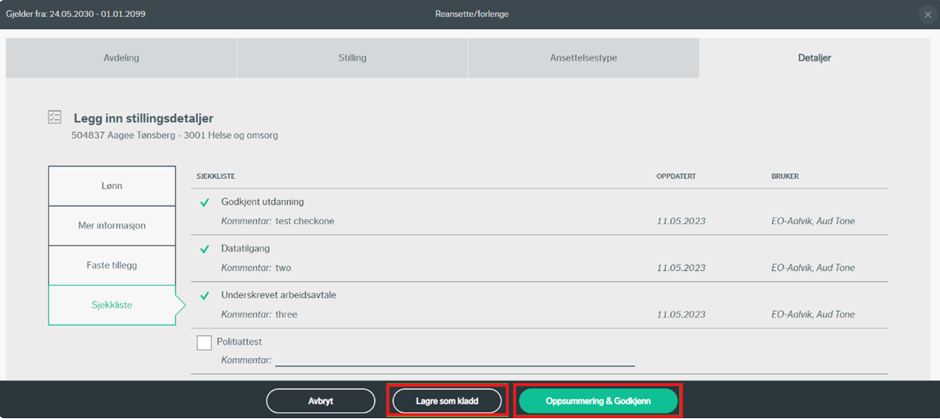 Når alle endringer er gjort trykker du på “oppsummering & godkjenning”. Merk også her at du kan lagre endringene som kladd, for å få mulighet til å gå tilbake og endre senere.