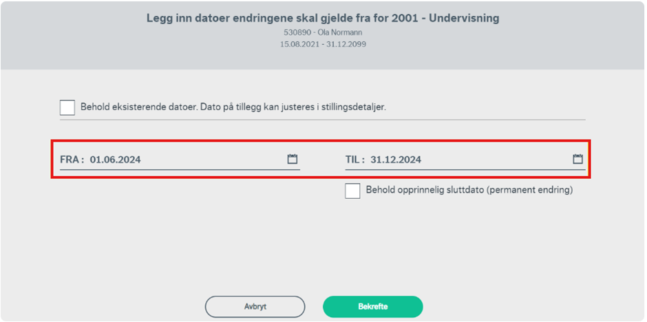 Velg datoer endringene skal gjelde fra og til. Dersom du velger en "dato til" som er før stillingens sluttdato, vil endringen gjelde frem til dette punktet og deretter reverseres stillingen tilbake til de originale verdiene igjen.