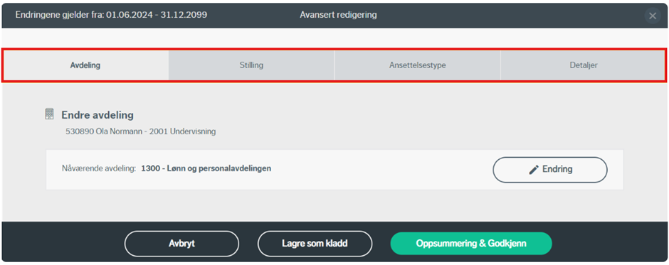 Etter at datoer er bekreftet, blir du tatt videre til ulike faner med mulighet for avansert redigering. Dato for endringen vil alltid være synlig øverst til venstre i skjermbildet.