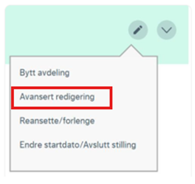 Avansert redigering av stilling tillater deg å redigere blant annet ressursens avdeling, stilling, ansettelsestype og stillingsdetaljer som lønn og tillegg, permisjoner osv. Det er mulig å gjøre flere endringer samtidig.