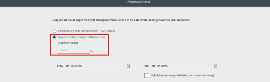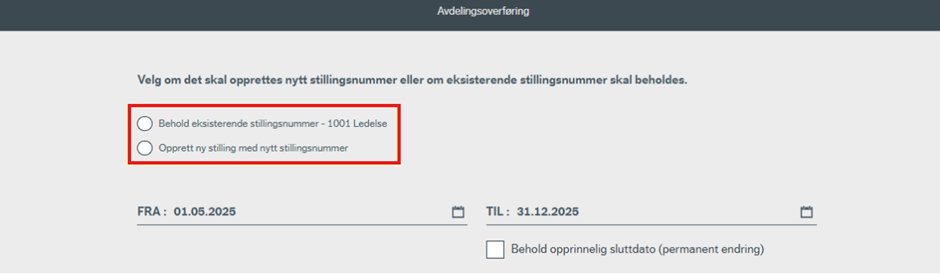Ved å trykke på «bytt avdeling» kommer du til et skjermbilde, hvor det må velges om det skal opprettes nytt stillingsnummer, eller om eksisterende stillingsnummer skal beholdes.
