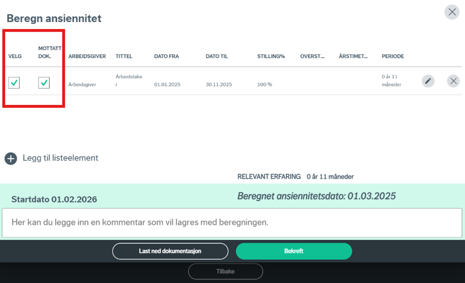 Personalmodulen hjelper her til med ansiennitetsberegning, og du har mulighet til å registrere og redigere den ansattes arbeidserfaring som skal inkluderes i ansiennitetsberegningen. Dette kan gjøres manuelt eller ved å velge elementer fra allerede registrert erfaring, hentet fra Webcruiter. For at man skal kunne bruke allerede registrerte stillinger i beregninger, må dokumentasjonen på de ulike stillingene være på plass. Dette gjøres ved å sette huk for «mottatt dokumentasjon».