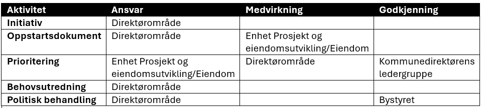 By- og stedsutvikling v/Eiendom eller Enhet Prosjekt og eiendomsutvikling er ansvarlig for kommunens byggeprosjekter. Unntatt er investeringer i bygning og eiendom foretatt av kommunale foretak, investeringer i parkanlegg (parkvesen), investeringer i kommunaltekniske anlegg (ingeniørvesen) og investeringer i utendørs idrettsanlegg (Kultur og idrett). Eier har ansvaret for at finansiering er i orden og at de nødvendige planer for å styre prosjektet er utarbeidet.