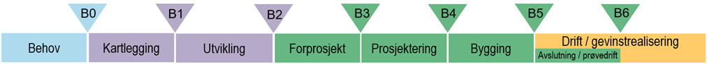 Figur 2: Prosjektmodellen med faser og beslutningspunkter (B0-B6). Behovsutredningsfasen (figur 1, under kpt. 1.3) tilsvarer fasen Behov i prosjektmodellen.